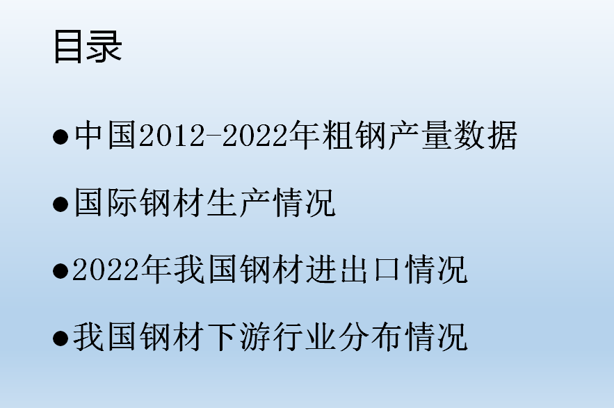 •我國(guó)現(xiàn)階段已經(jīng)初步實(shí)現(xiàn)城鎮(zhèn)化的建設(shè),隨著房地產(chǎn)需求的下滑,我們普通鋼材很難有一個(gè)大的增量,但是我國(guó)的特殊鋼材還有很大的發(fā)展空間。結(jié)合國(guó)家鋼材發(fā)展現(xiàn)狀,我們也慢慢的理解公司制定“高端、國(guó)有、人無(wú)我有”政策的現(xiàn)實(shí)依據(jù),希望大家能出通過(guò)了解行業(yè)發(fā)展的方向,明確目標(biāo),開(kāi)發(fā)客戶,更好的規(guī)劃自己的銷售,取得好的業(yè)績(jī)。